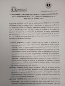 Con el objetivo de desarrollar acciones conjuntas, nuestras autoridades del Distrito V del Colegio de Ingenieros se reunieron con sus pares del Rectorado de la Universidad Católica de La Plata para firmar un convenio de cooperación institucional y académica, con el fin de llevar a cabo actividades de carácter científico-formativo, docente y de divulgación.