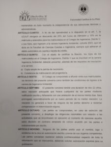 El acuerdo firmado entre ambas instituciones establece un descuento del 25 % en el Curso de Admisión y 15 % en la matricula y aranceles para los matriculados en el Colegio de Ingenieros, Distrito V, y sus hijos, que ingresen a la carrera de Ingeniería Ambiental, cohorte 2023, que se dicta en la Facultad de Ciencias Exactas e Ingeniería.