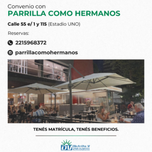 El Distrito V suscribió un convenio con la parrilla Como Hermanos, ubicada en 1 y 55 en el Estadio UNO, frente a la sede del Distrito. Nuestros/as matriculados/as podrán acceder a un 10 % de descuento en su consumo presentando tu carnet. Noticias Relacionadas 5 noviembre, 2025CENA DE CAMARADERÍA Y ENTREGA DE MEDALLAS 5 noviembre, 2025CONVENIO PARA ACCEDER A CURSOS Y CAPACITACIONES 29 octubre, 2025ACTUALIZA TUS DATOS EN SIGMA PrevNext