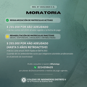 ✍ Mediante la Resolución 1541/25 del Consejo Superior se prorroga la Moratoria para regularización de deudas de matricula generadas con anterioridad al 1° de Enero.